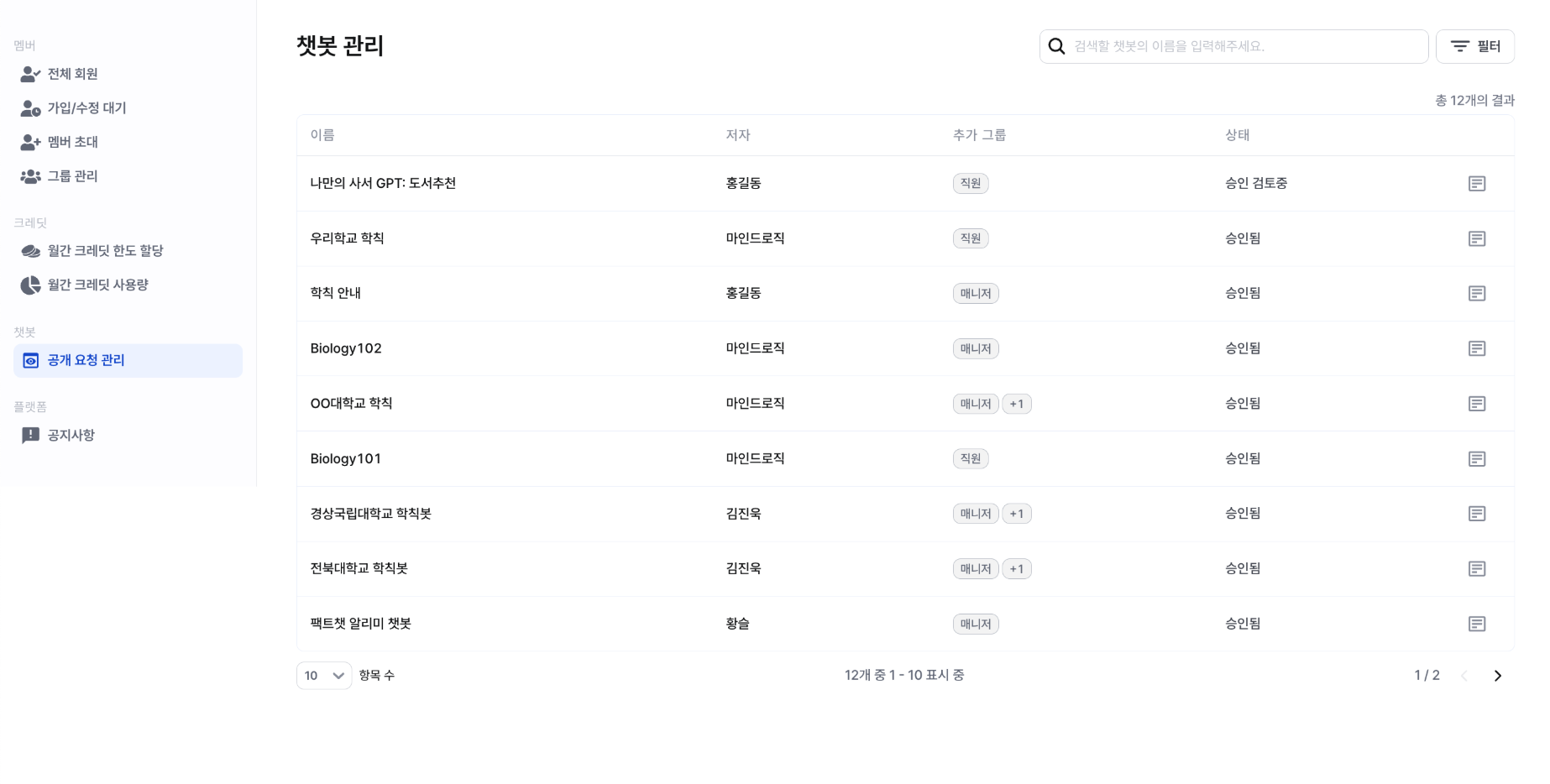 테이블 내 각 행에서 승인 요청한 챗봇의 이름, 챗봇 제작자, 그룹 이름, 승인 상태를 확인할 수 있습니다.Q. 그룹 이름은 어떤 정보를 가리키나요?A. 챗봇 공개 요청 시, 사용자는 해당 챗봇을 볼 수 있는 그룹을 지정할 수 있습니다. 관리자는 해당 그룹 정보를 통해 챗봇 공개 여부를 검토할 수 있습니다.