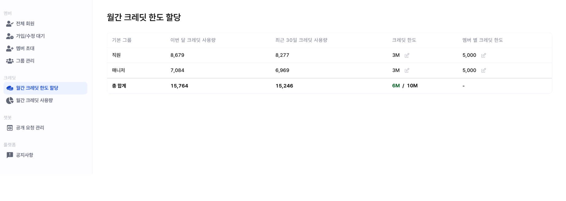 - 관리자는 그룹별 크레딧 한도와 그룹 내 멤버별 크레딧 한도를 설정할 수 있습니다.