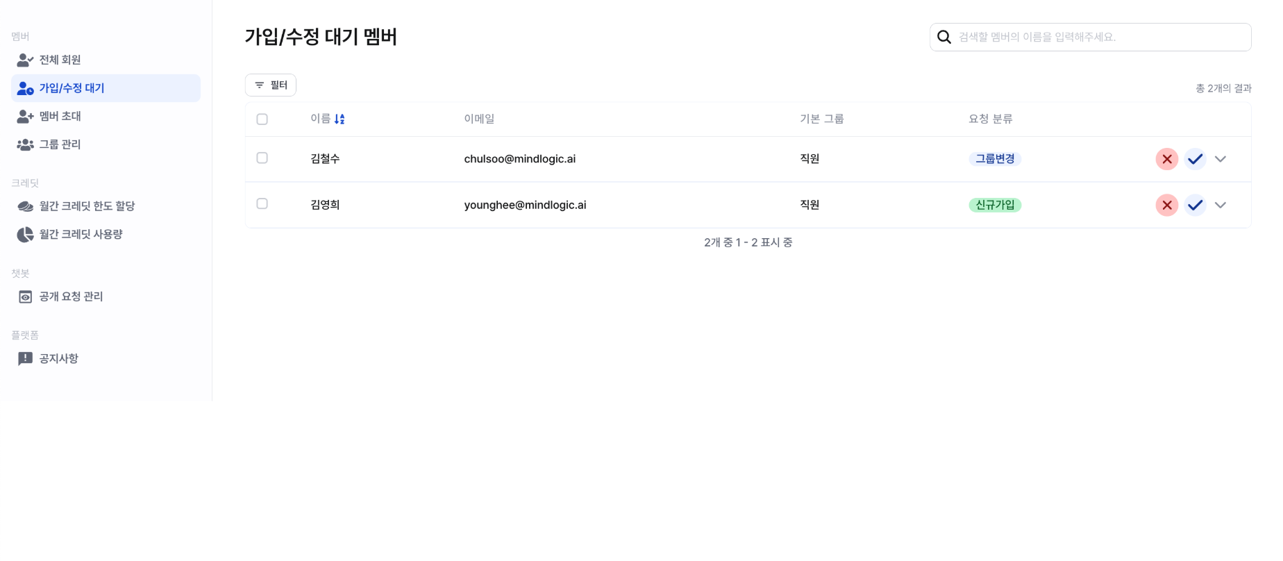 새로운 사용자의 가입 요청이나 기존 회원의 정보 수정 요청을 승인 또는 거부할 수 있는 공간입니다.