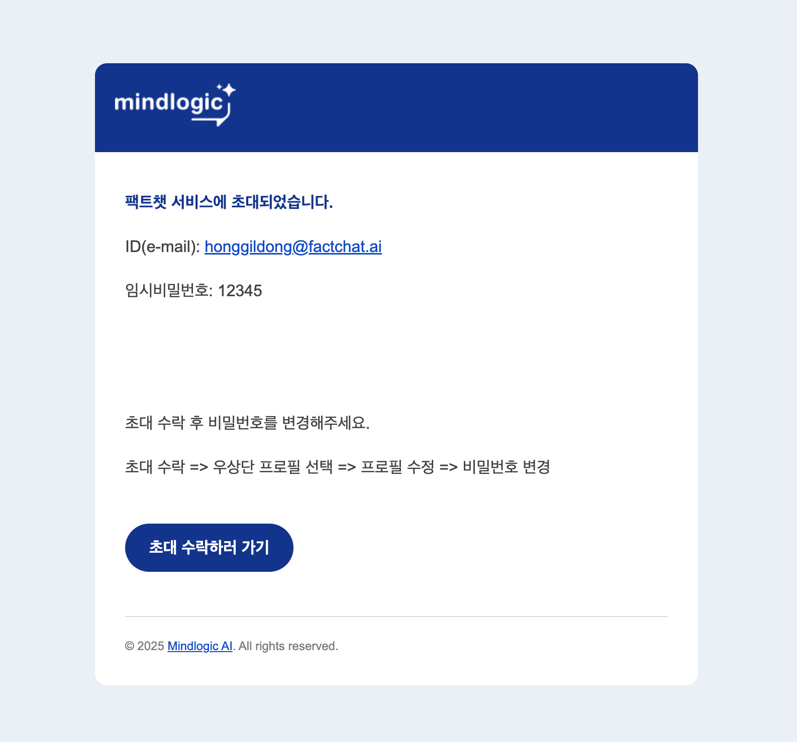 메일 내 '초대 수락하러 가기' 버튼을 클릭하여 팩트챗 초대 가입 페이지로 접속 후 임시 비밀번호를 입력하여 가입을 완료합니다.반드시 메일 내 '초대 수락하러 가기' 버튼을 통해 가입을 완료하여야 하며, 직접 접속을 통한 로그인은 불가능합니다.만약 초대 메일이 오지 않을 경우 관리자에게 문의해주세요.