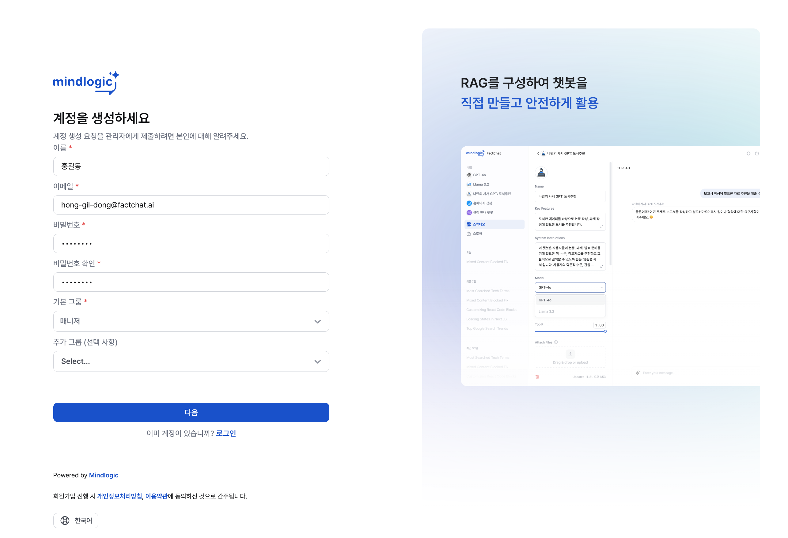 조직 내 관리자가 사용자를 직접 초대하는 방식입니다. 사용자는 초대 메일을 통해 팩트챗에 가입할 수 있습니다.