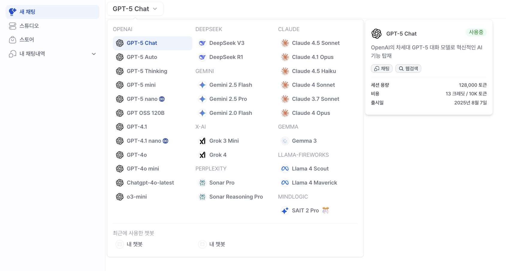 챗봇 선택 메뉴는 대시보드 상단에서 사용 가능한 모든 AI 모델을 한눈에 보여주고, 클릭 한 번으로 원하는 챗봇으로 전환할 수 있는 기능입니다.
